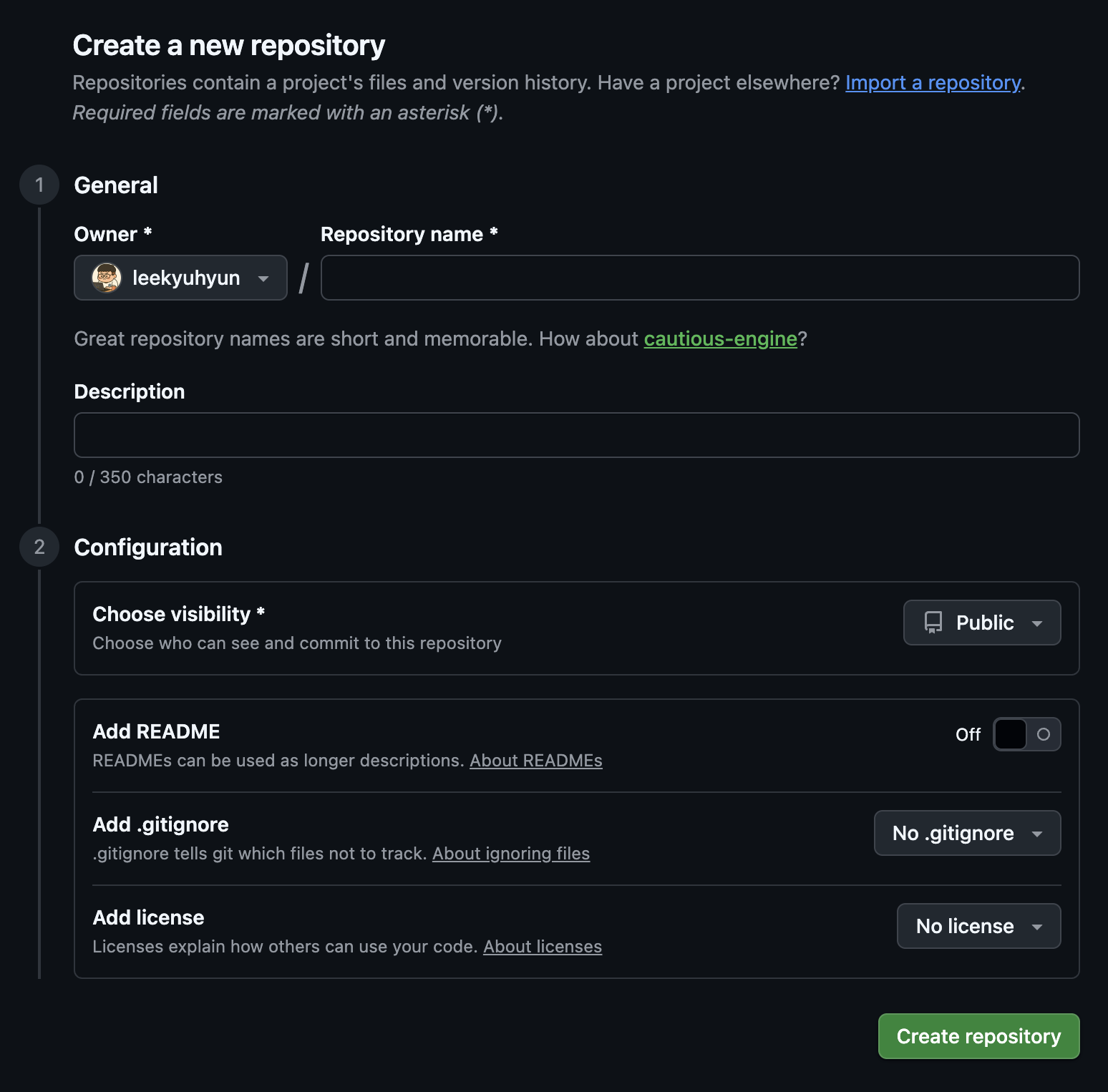 //로컬 프로젝트 터미널 창에 하나줄씩 입력 git remote add origin https://github.com/leekyuhyun/test_repo.git ㄴ git remote add (별칭) (레포지토리 주소) git branch -M main ㄴ 로컬 저장소에 브랜치 생성 git push -u origin main -
