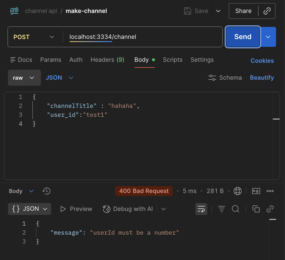 지금까지는 if (user_id && channel_name)와 같이 조건문을 사용해 일일이 입력값을 검증하였지만 하지만 반복되는 코드가 많아지는 불편함이 있었다.