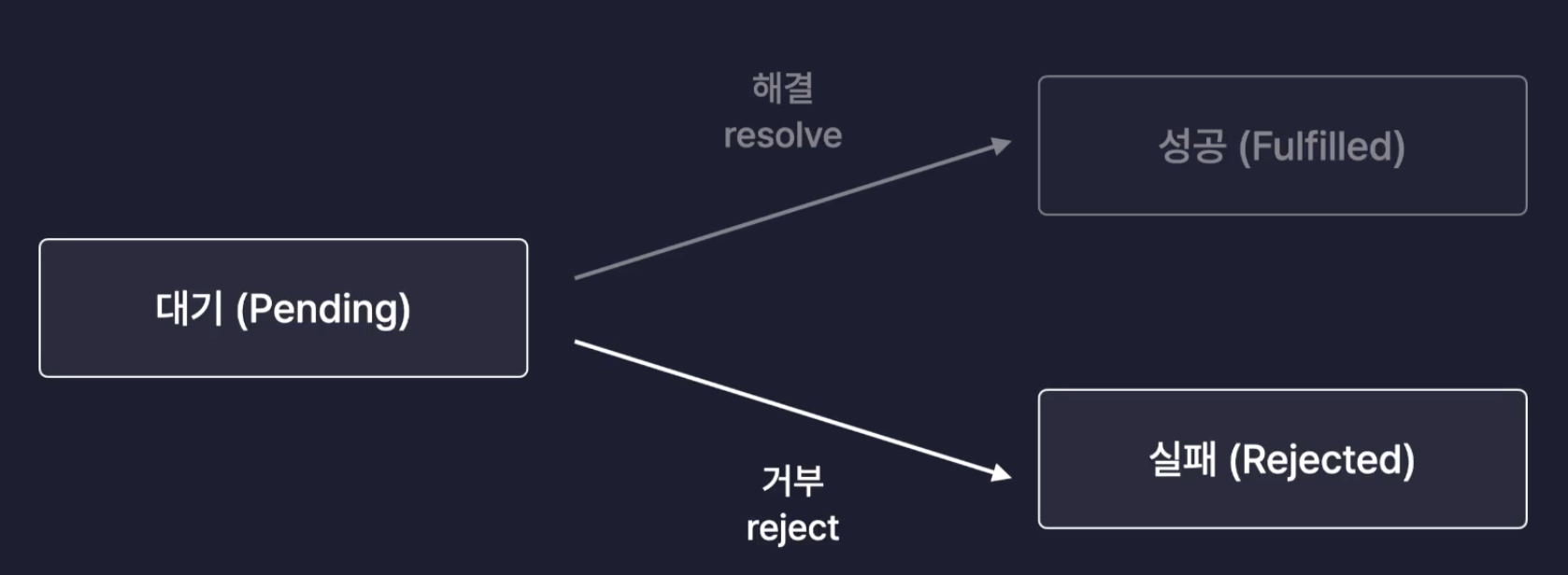 실패 (Rejected): 작업이 실패하거나 오류가 발생한 상태 (reject 호출).