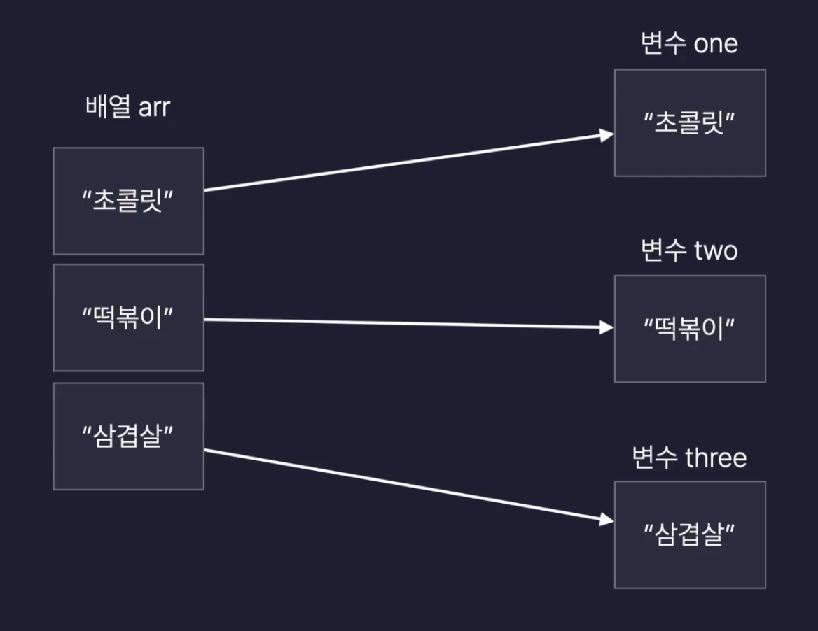 배열의 요소들을 개별 변수에 담을 때, 기존의 번거로운 방식 대신 사용하는 간결한 문법이다.