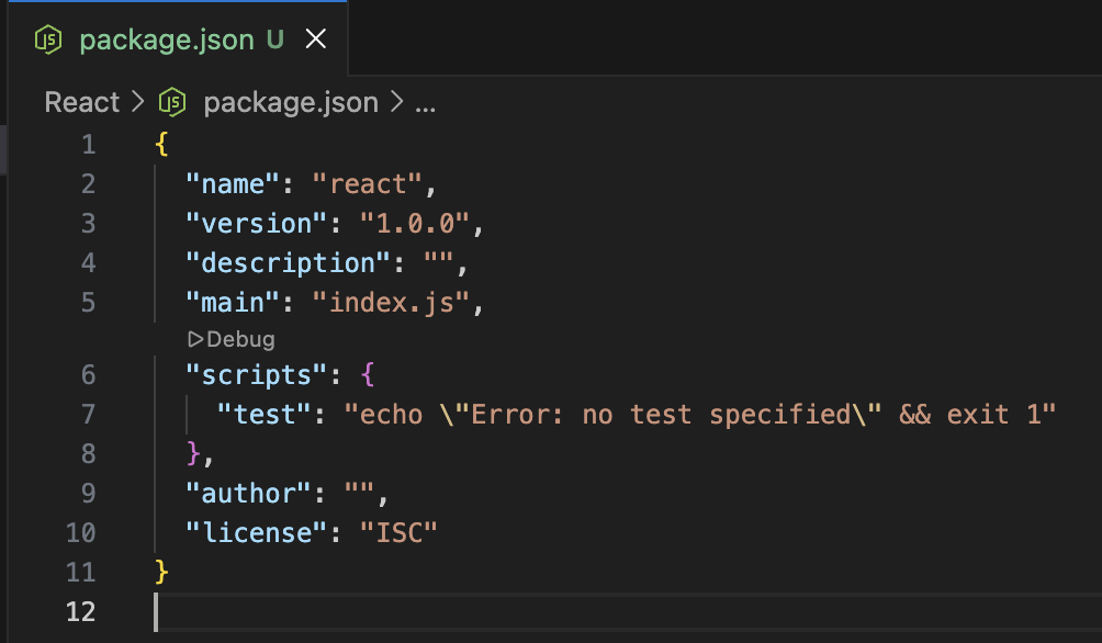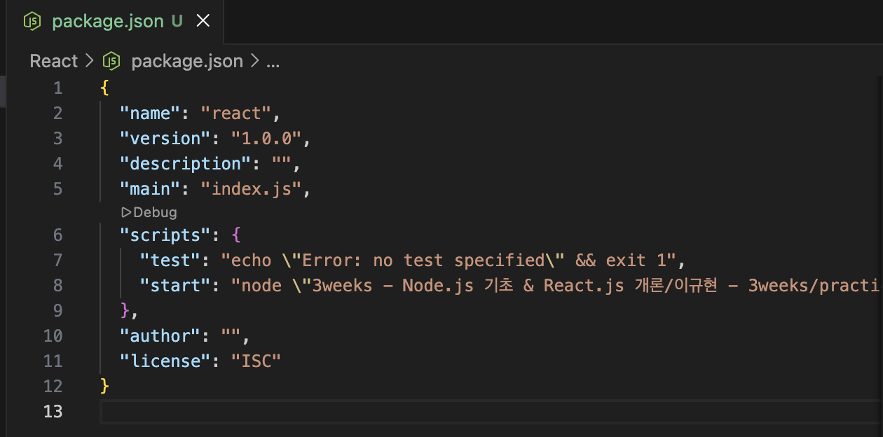 다음 명령어를 입력하고 모두 엔터를 누르게 되면 다음과 같은 Package.json이라는 파일이 만들어진다.