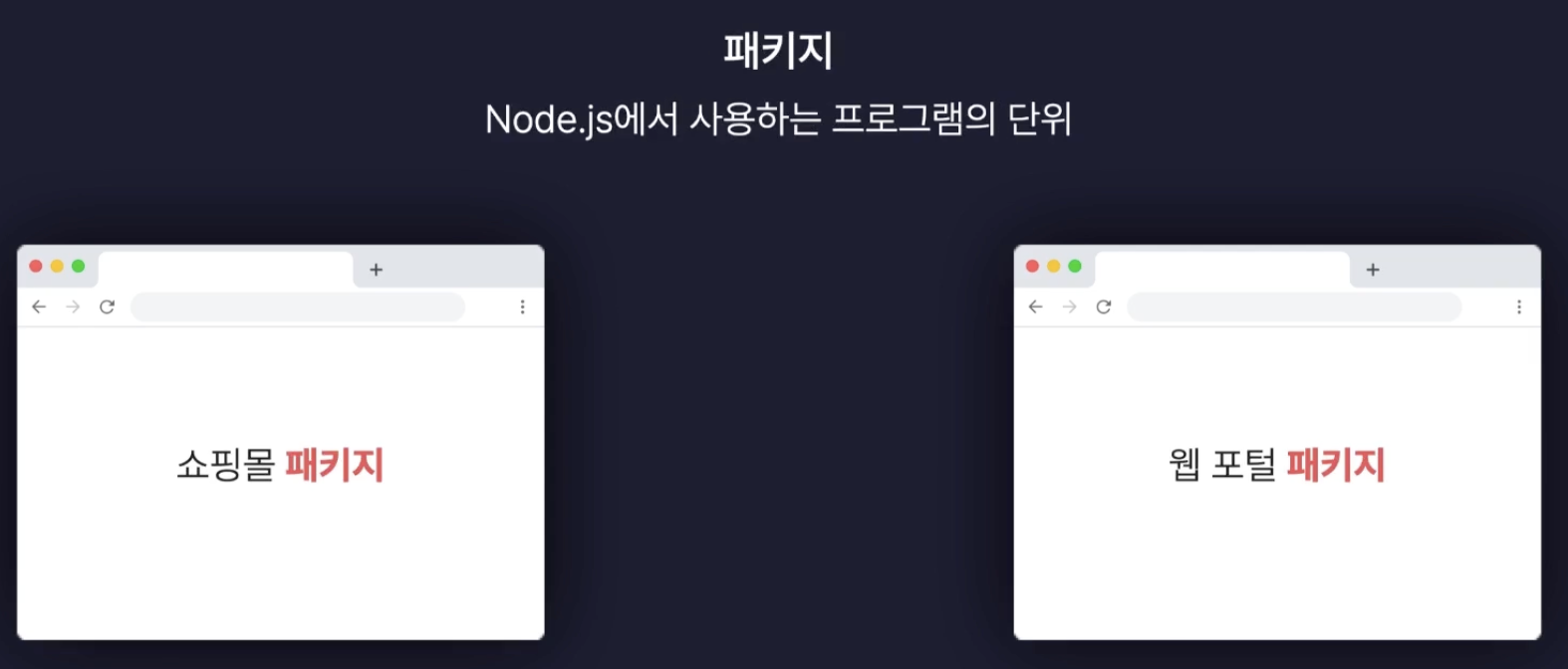 패키지: Node.js에서 사용하는 프로그램의 단위이다.