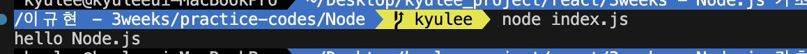 ex) index.js가 루트 디렉터리가 아닌 src 폴더 안에 위치하고 있다면 터미널에서 cd src로 위치를 옮기고 나서 node index.js 명령어를 입력해야 hello node.js가 출력됩니다.