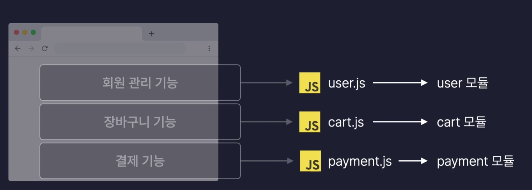 아래 사진과 같이 기능별로 나뉘어진 각각의 자바스크립트 파일들을 모듈이라는 이름으로 부른다.