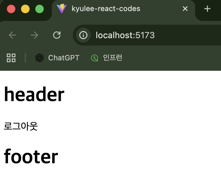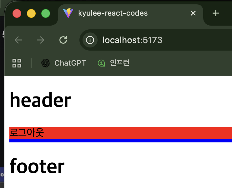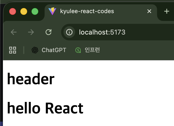 <Header />를 작성하면 된다. App 컴포넌트가 화면에 렌더링 될 때 Header 컴포넌트의 반환 값을 불러와서 함께 렌더링 시켜 주게 된다. -