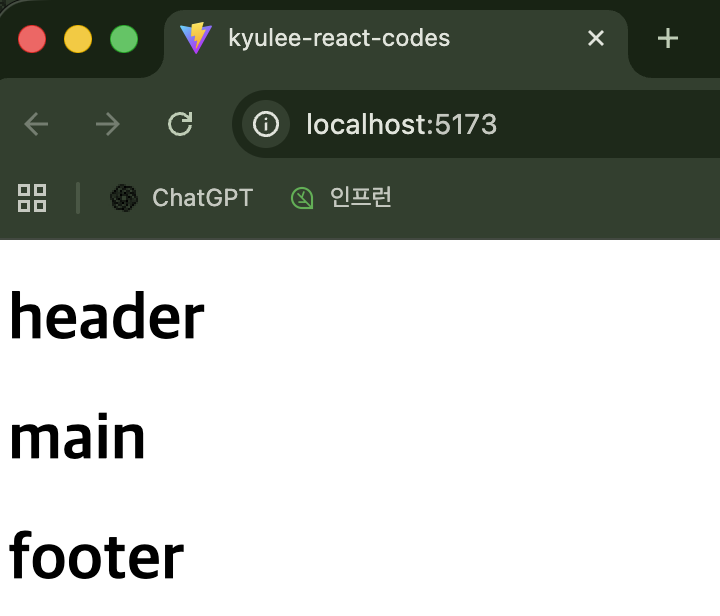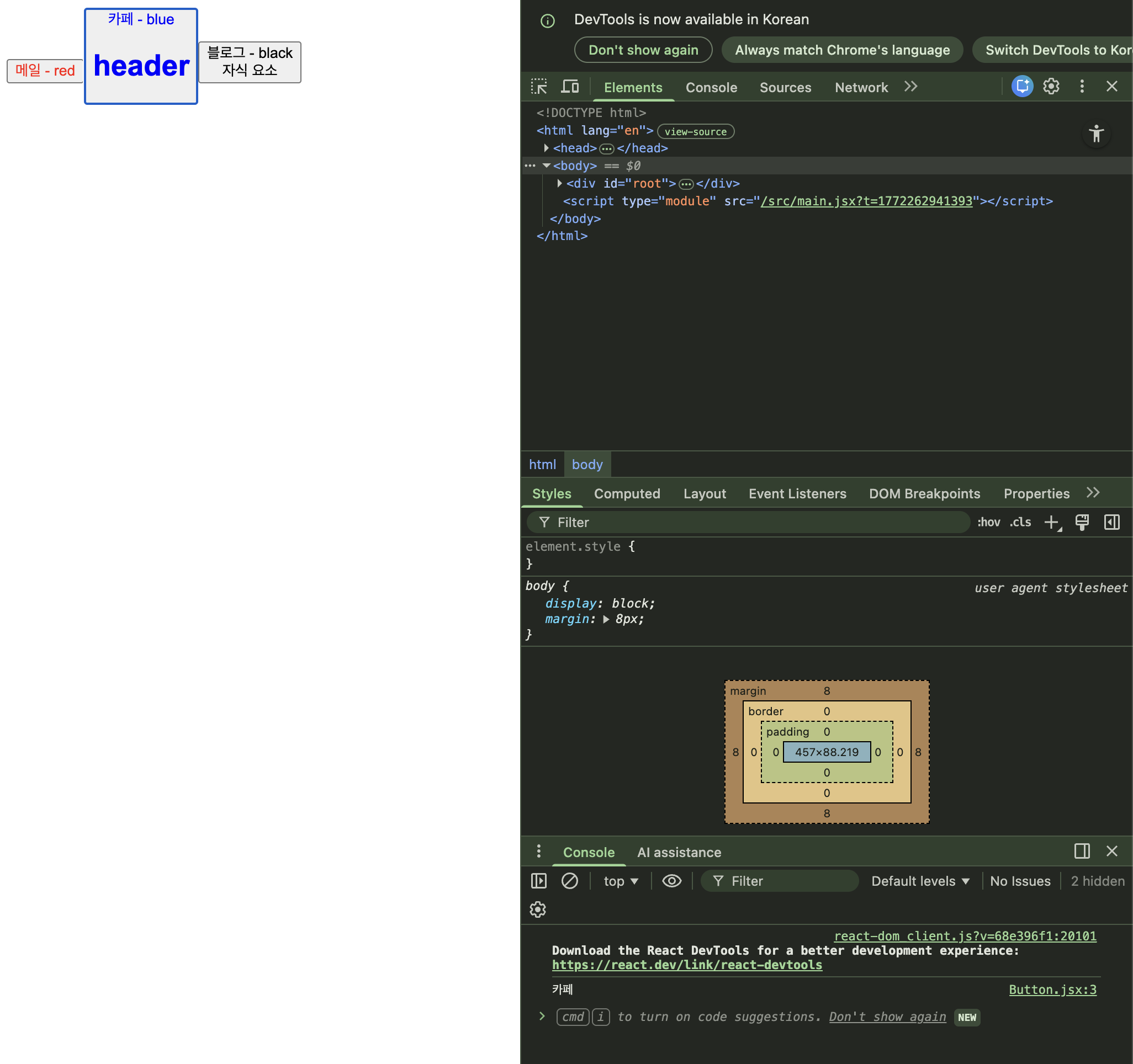 - app.jsx에 Header 컴포넌트를 추가하였다. 하지만 화면을 보면 header라는 문구가 보이지 않는다. main.jsx에서 render라는 메서드를 통해 화면에 렌더링하고 있는 컴포넌트는 App 컴포넌트이기 때문이다.