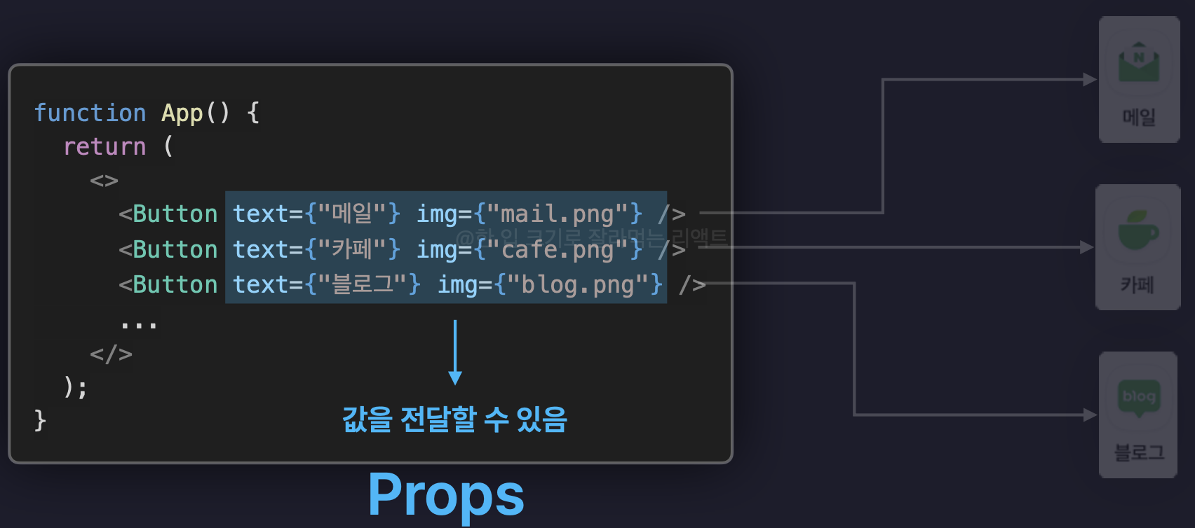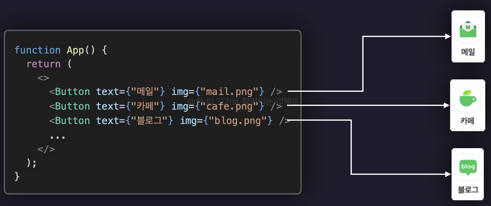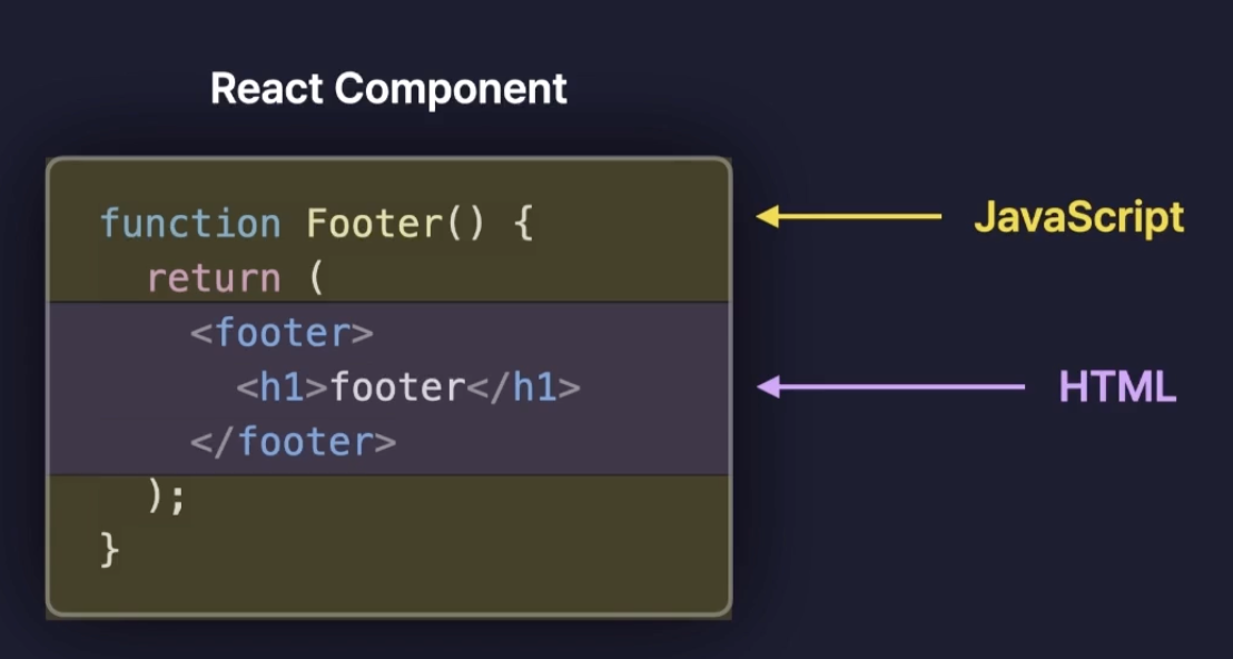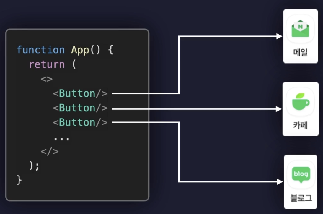 리액트에서는 이런 자바스크립트 함수가 이렇게 html 태그를 반환하도록 설정할 수 있으며 **html 태그들을 반환하는 함수를 컴포넌트 (component)**라고 부른다.
