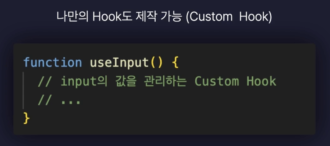 useInput()을 두 번 호출해 각각 독립적인 State와 핸들러를 만들었다. 같은 로직을 여러 곳에서 재사용할 수 있어 코드 중복을 크게 줄일 수 있다. 커스텀 Hook은 src/hooks/ 폴더 안에 모아두는 것이 일반적인 컨벤션이다