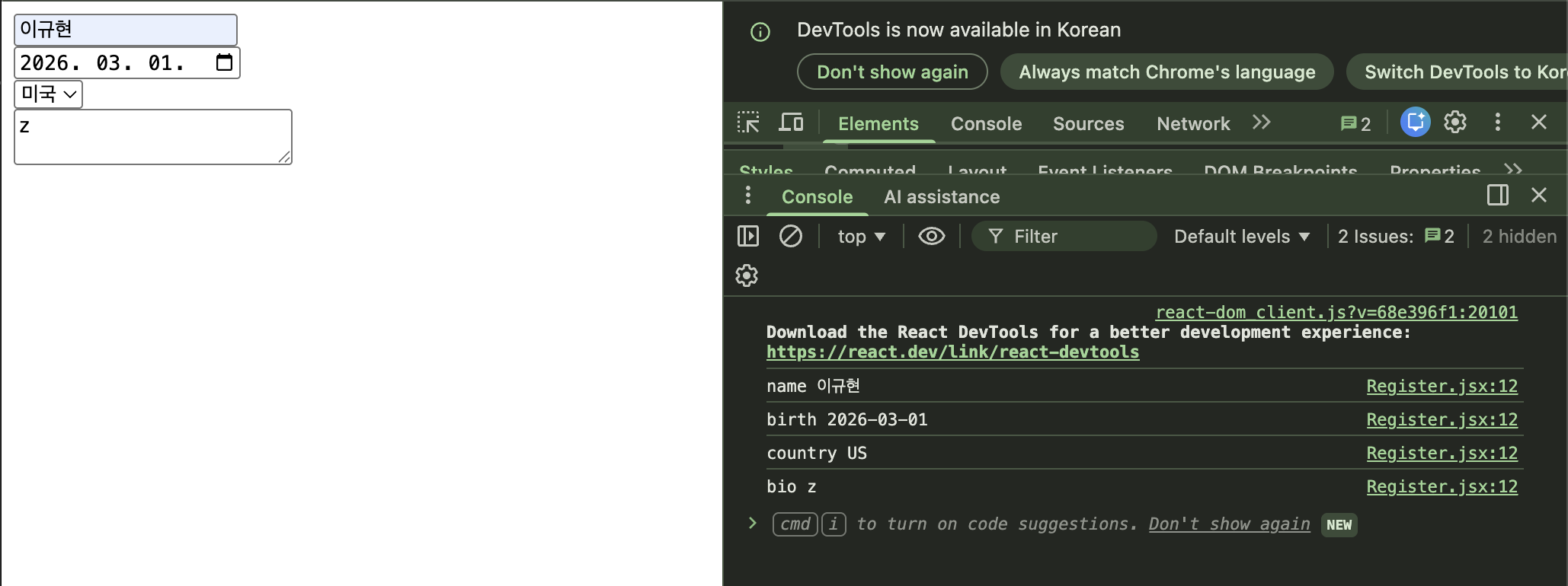 입력 필드가 늘어날수록 State와 핸들러도 같이 늘어나 코드가 길어지는 단점이 있다.