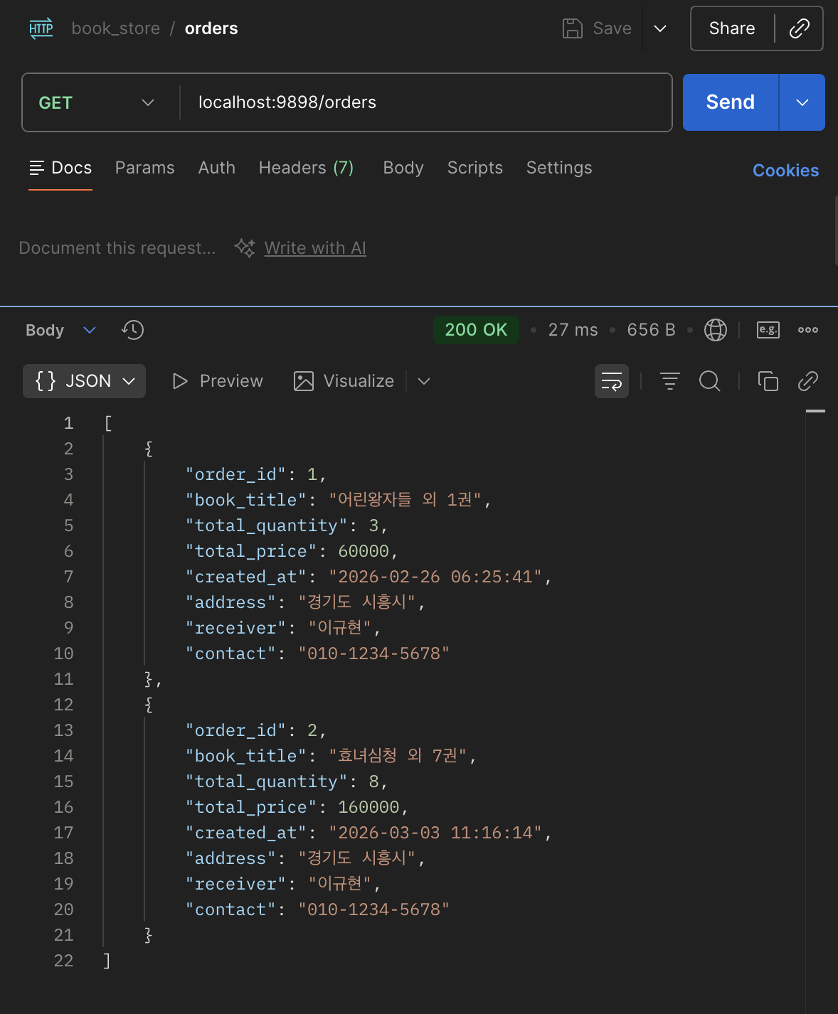 export const getOrders = async (req, res): async 함수로 선언const promiseConn = conn.promise(): Promise 기반 데이터베이스 연결 객체 생성const [results] = await promiseConn.execute(sql): await로 SQL 쿼리 완료될 때까지 대기LEFT JOIN: orders 테이블의 모든 행을 포함하고 delivery 테이블의 일치하는 배송 정보를 함께 조회- SELECT 절: order_id, book_title, total_quantity, total_price, created_at, address, receiver, contact 정보 조회