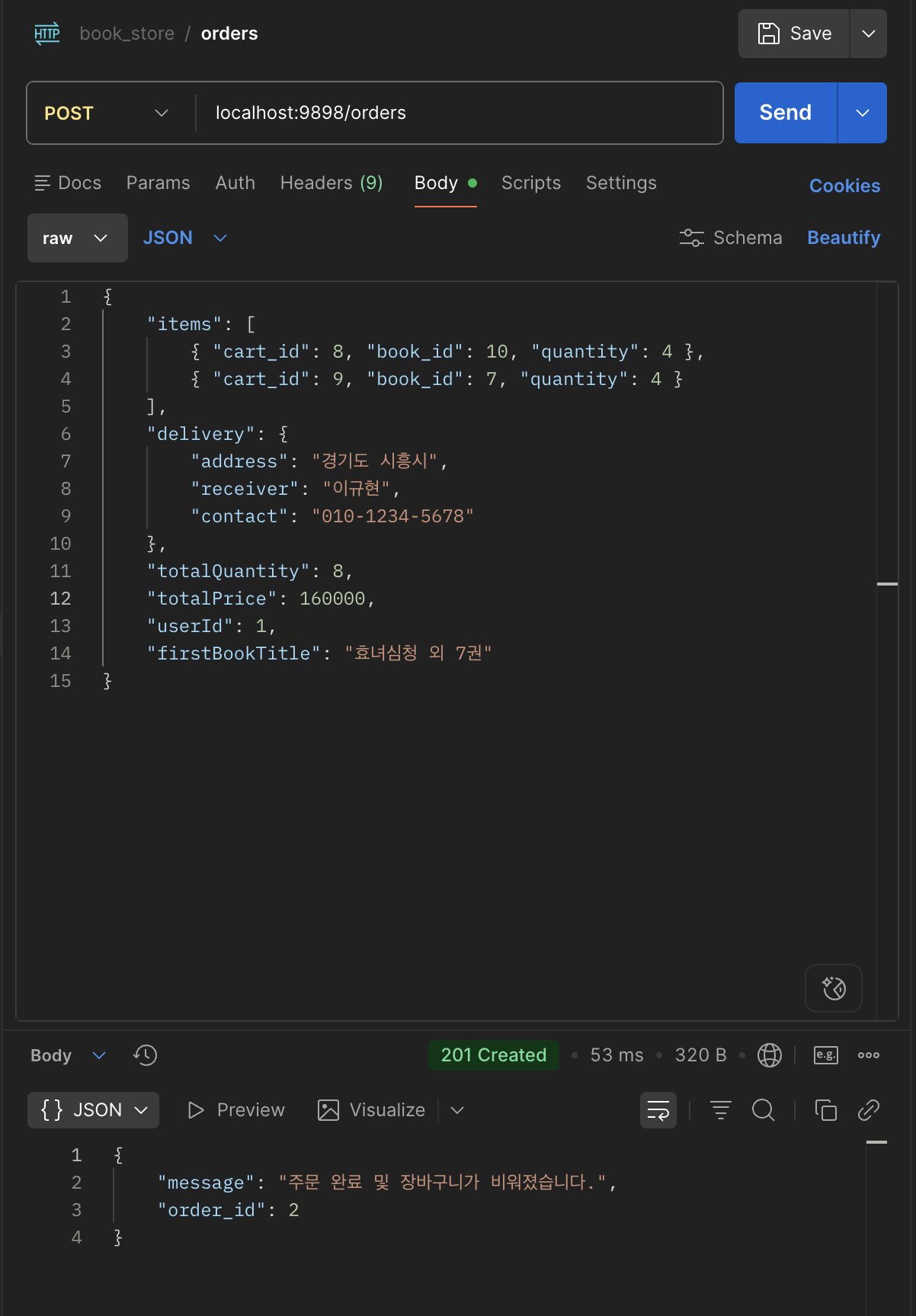 .json({ message: '주문 완료 및 장바구니가 비워졌습니다.', order_id });