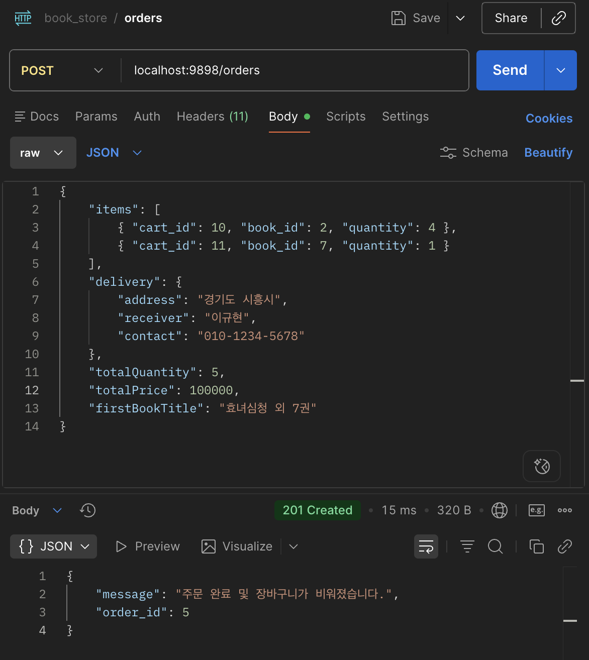 .json({ message: '주문 완료 및 장바구니가 비워졌습니다.', order_id });