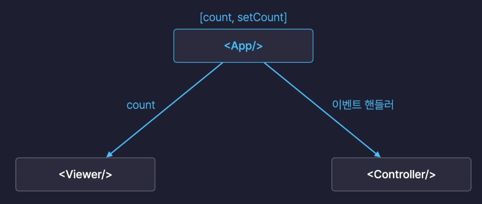 <Viewer count={count} />로 현재 카운트 값을 Viewer에 내려주고, <Controller onClickButton={onClickButton} />로 버튼 클릭 핸들러를 Controller에 내려준다.